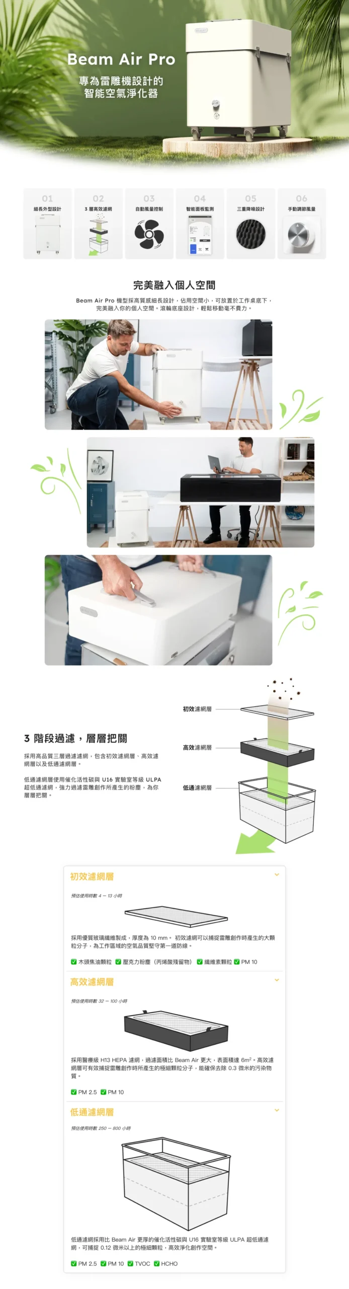 採用高品質三層過濾濾網,包含初效濾網層、高效濾網層以及低通濾網層。