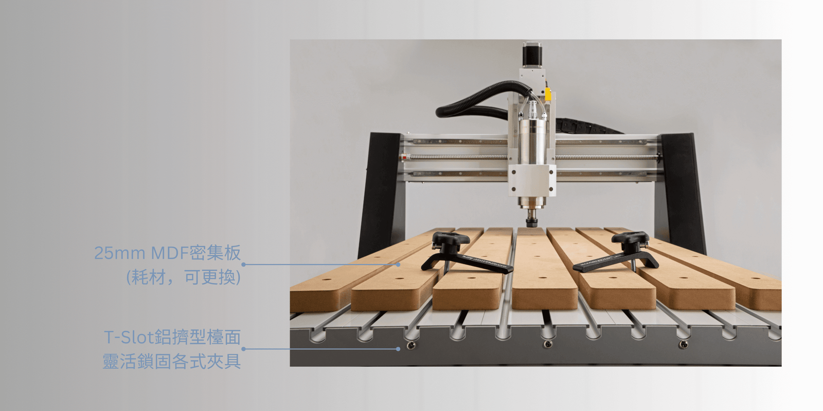 上層MDF板用於保護鋁擠檯面,避免因切削過深導致刀具或檯面受損,同時具備經濟實惠、易於更換的特性。