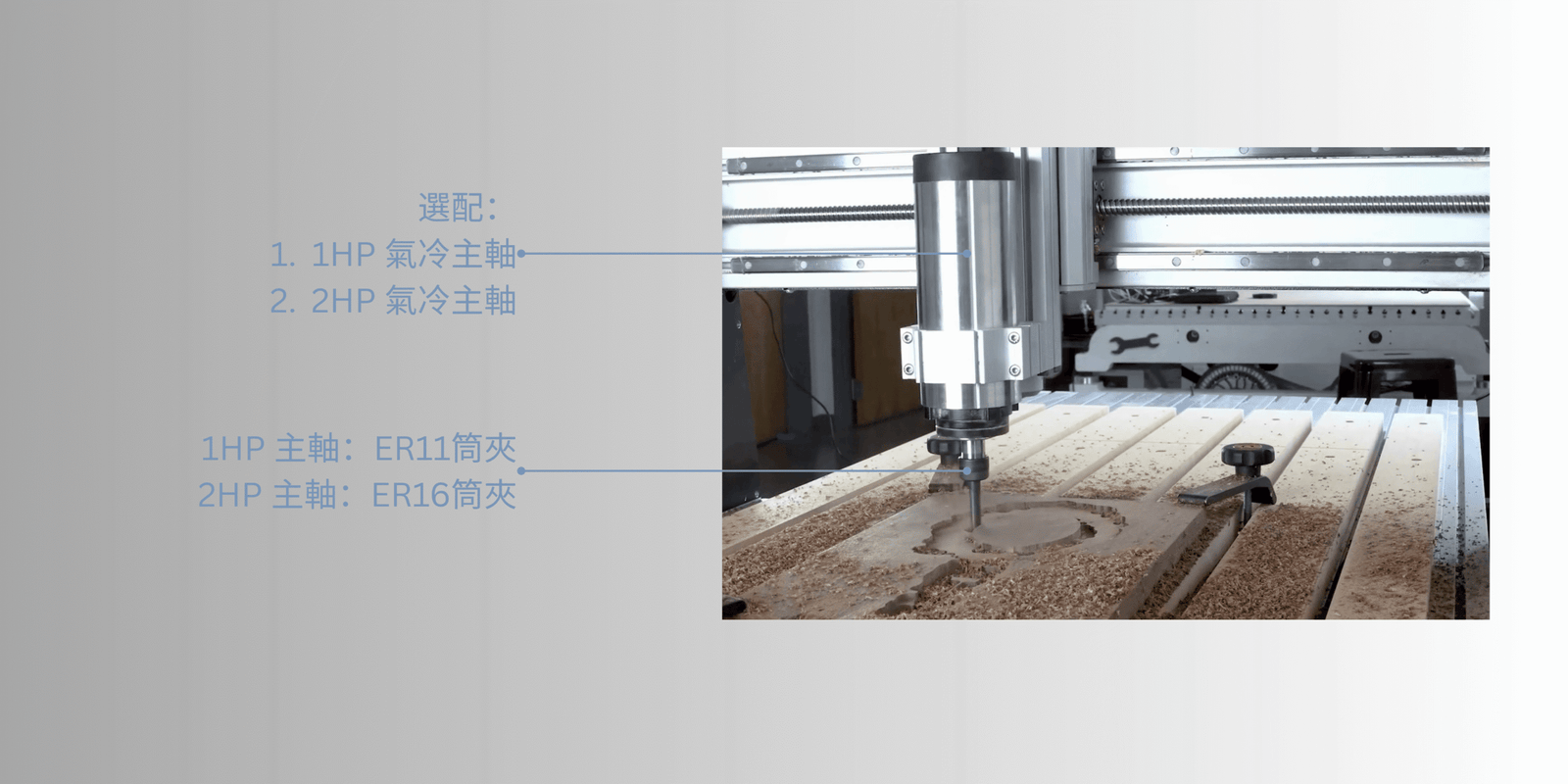 主軸功率:0.8kW 1HP 氣冷主軸 / 1.5kW 2HP 氣冷主軸