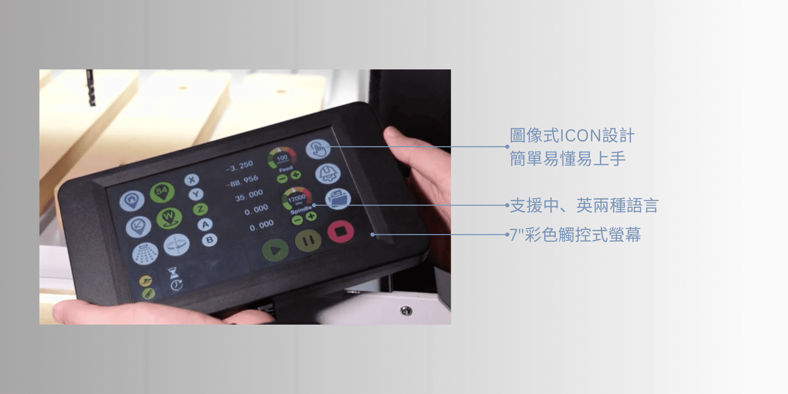 控制系統搭配 7 吋觸控螢幕,以圖像化設計與中英文支援呈現,讓每位使用者都能輕鬆理解、自然操作,體驗更友善的智慧互動。無須學習複雜的 G-code 或 CAM 軟體,適合初學者、老師與喜歡動手做但不想寫程式的你。
