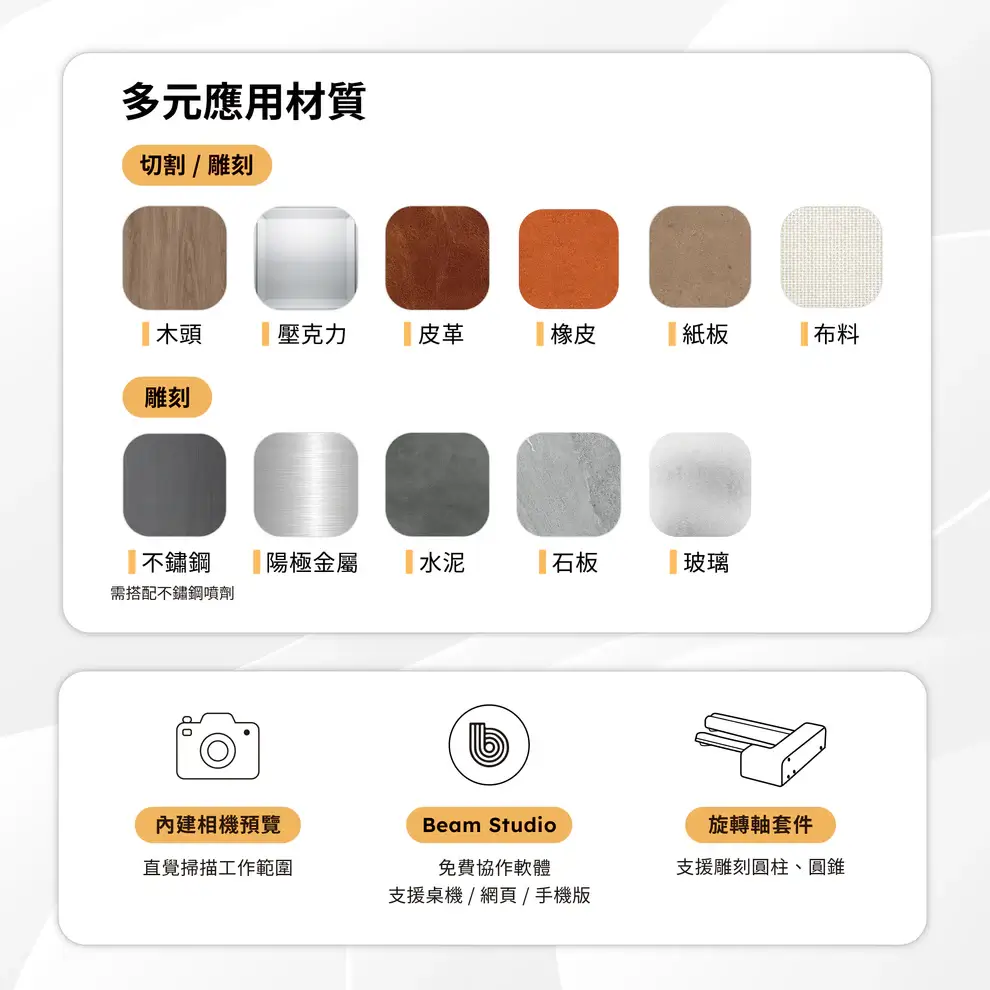 可加工材質:木材、壓克力、皮革、紙板、竹子、布料、橡膠、玻璃、石材、陽極金屬、不銹鋼等