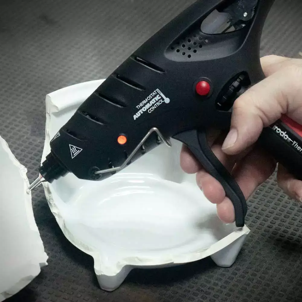 特殊的防滴膠頭設計,可讓你在工作時,避免熔膠滴落或是阻塞噴嘴。此產品設計有可折式支撐架方便使用者在熱熔膠槍加熱或冷卻時使用。